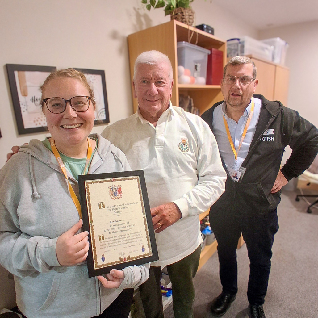 Sparkfish – A Redhill Christian organisation that engages with young people in schools across Reigate, Redhill and Merstham, offering support in important areas of the curriculum and school life was awarded a grant from the High Sheriff Youth Awards last year and this week Ron Enticott from the HYSA, went along to the Sparkfish offices to present Director – Harriet Pearce, and helper – Jim Hills with a certificate from the High Sheriff in recognition of great and valuable services to the community.