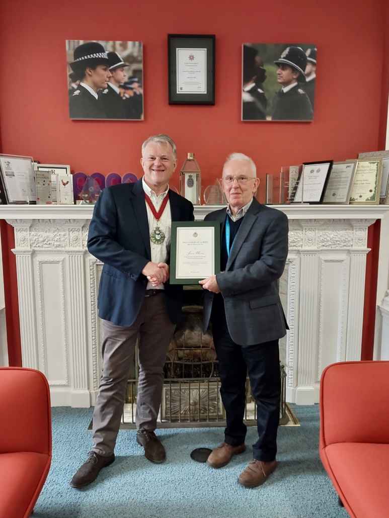 I had the pleasure of presenting a High Sheriff Award to Simon Morris yesterday at the Surrey Police Headquarters Mount Browne. Simon was unable to attend the Award Ceremony last week but his name was read out and his citation included in the programme. He has volunteered with Surrey Police since 2019 in the Reigate and Banstead area and has made a significant contribution to community safety, dedicating over 1,100 hours to the Force.