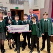 The photograph show head teacher, James Malley and the representatives of the Class 8YI with the winning cheque.