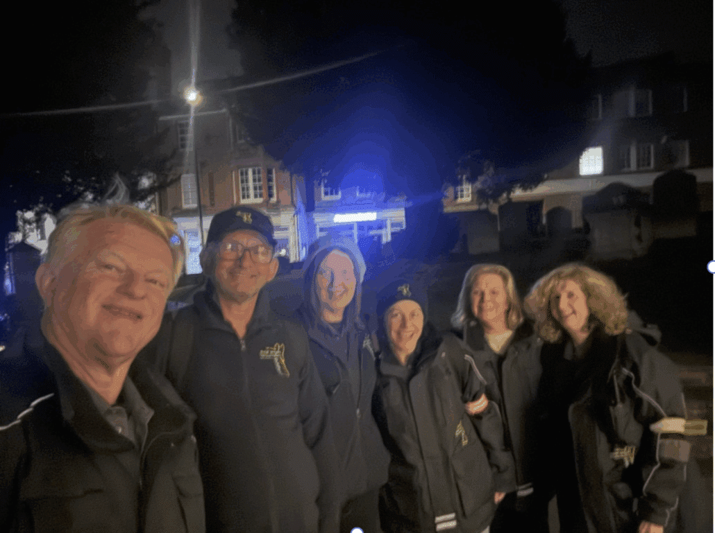 Having lived in Guildford for over 25 years I have been aware of the wonderful Street Angels and the part they have played keeping people safe and with their presence helping to prevent incidents from occurring. Last night Suzanne and I joined them on their patrol. They go out every Friday and Saturday night from 10.30pm to 4am in two patrols of two or three volunteers, covering all areas from the station up to G-Live checking in with the pubs and clubs and looking out for people who may need assistance.